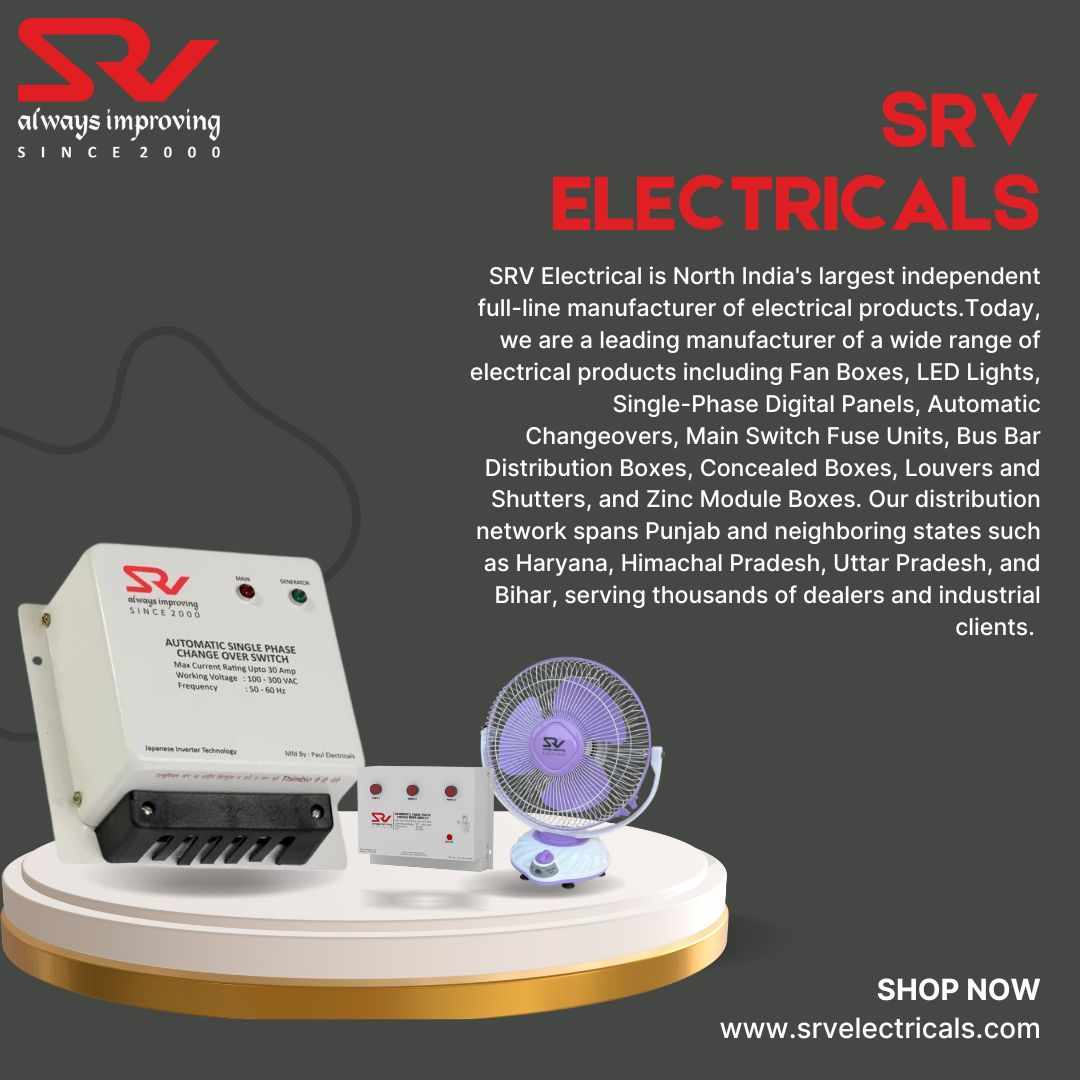 Find quality electrical essentials at SRV Electricals. Our varied assortment consists of everything from Fan Boxes, Concealed Boxes, Modular Boxes, and Junction Boxes to Change Over Switches, Bus Bar and MCB Distribution Boxes. We also carry LED Downlighters, Flood Lights, Exhaust Fans, Room Heaters, Door Bells, and Outdoor Lights. Power safely with Kitkat Fuses, Main Switches, Fan Downrods, Reversing Switches, and Water Pump Starters. For daily use, check out our 2 Pin, 3 Pin, and 5 Pin Tops, Ventoguard, and more — used by thousands of Indians.